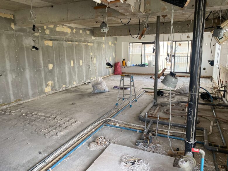 壁や天井の下地、床材がすべて撤去され、見えてきたのはコンクリートの素地と配管だけ。